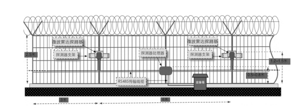 探測器采用壁掛方式布設在圍欄上,探測器之間通過RS-485總線相連,并匯聚到探測處理主機。此方案融合微波雷達和MEMS振動兩種入侵探測技術,兼具主動和被動探測方式,具有預警距離遠,定位精度高,適應性強,易于安裝和調試等特點,適用于民航、核電、物流、石油、電力、煙草、公安、司法等行業。